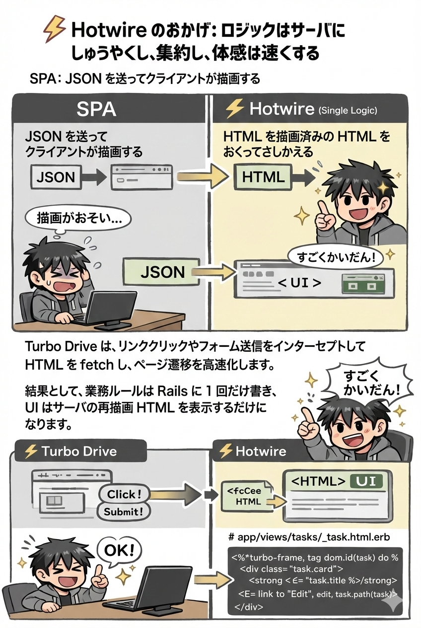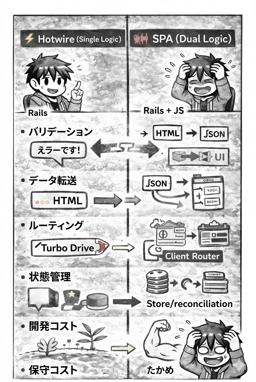 | 観点 | ⚡ Hotwire(Single Logic) | 🧩 SPA(Dual Logic) |