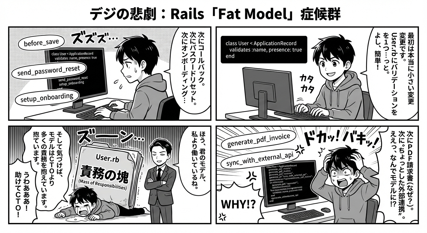 ...Railsのモデルを開いて 「このファイル、天気があるな…」 と思ったら、それは Rails fat model(モデル肥大化) です。